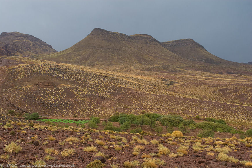 La mule paraît aujourd’hui docile, probablement trop éloignée de son étable pour songer à une nouvelle fugue. La route sera longue, histoire de grignoter le temps perdu la veille. A la mi-journée, nous faisons halte dans le village d’un ancien muletier ami de Mohamed. Dans l’après-midi nous surprend un violent orage. Sans veste ni imperméable, je redouble l’allure, pressé aussi de fuir les mélopées soûlantes distillées par Abdou pour motiver sa monture et célébrer la beauté aride des paysages.