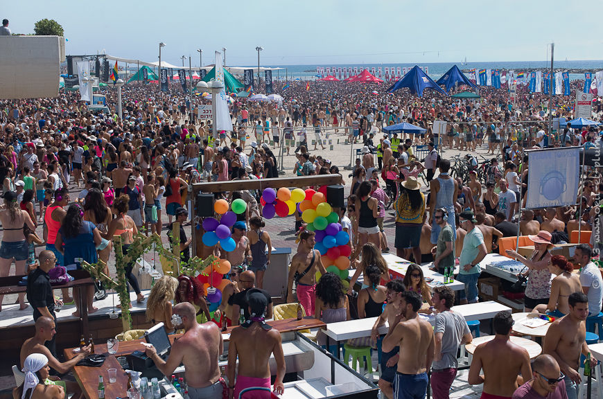 La Gay Pride prend sa pleine dimension à son point d’arrivée sur une des plages de Tel Aviv. Des centaines de milliers de jeunes s’y pressent et s’y mélangent, à défaut de se déhancher. Trop chaud pour cela.