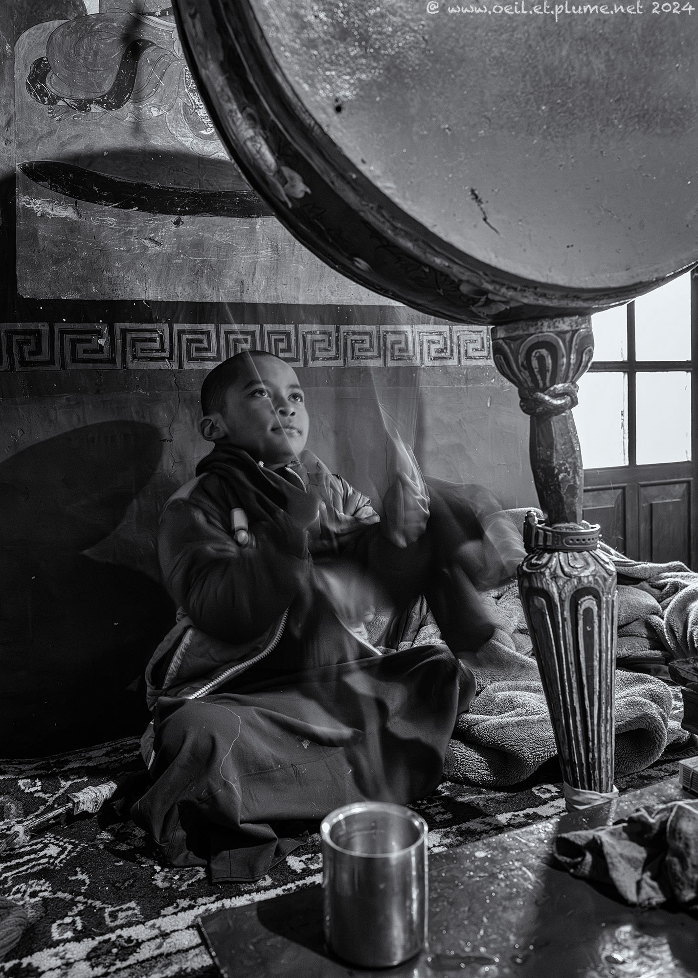 This is where the young novice comes into play. Tremendously concentrated, the boy synchronises his beats with the prayer cadence, looking often at the monks to anticipate his part. The scene is fascinating to observe and to connect with.