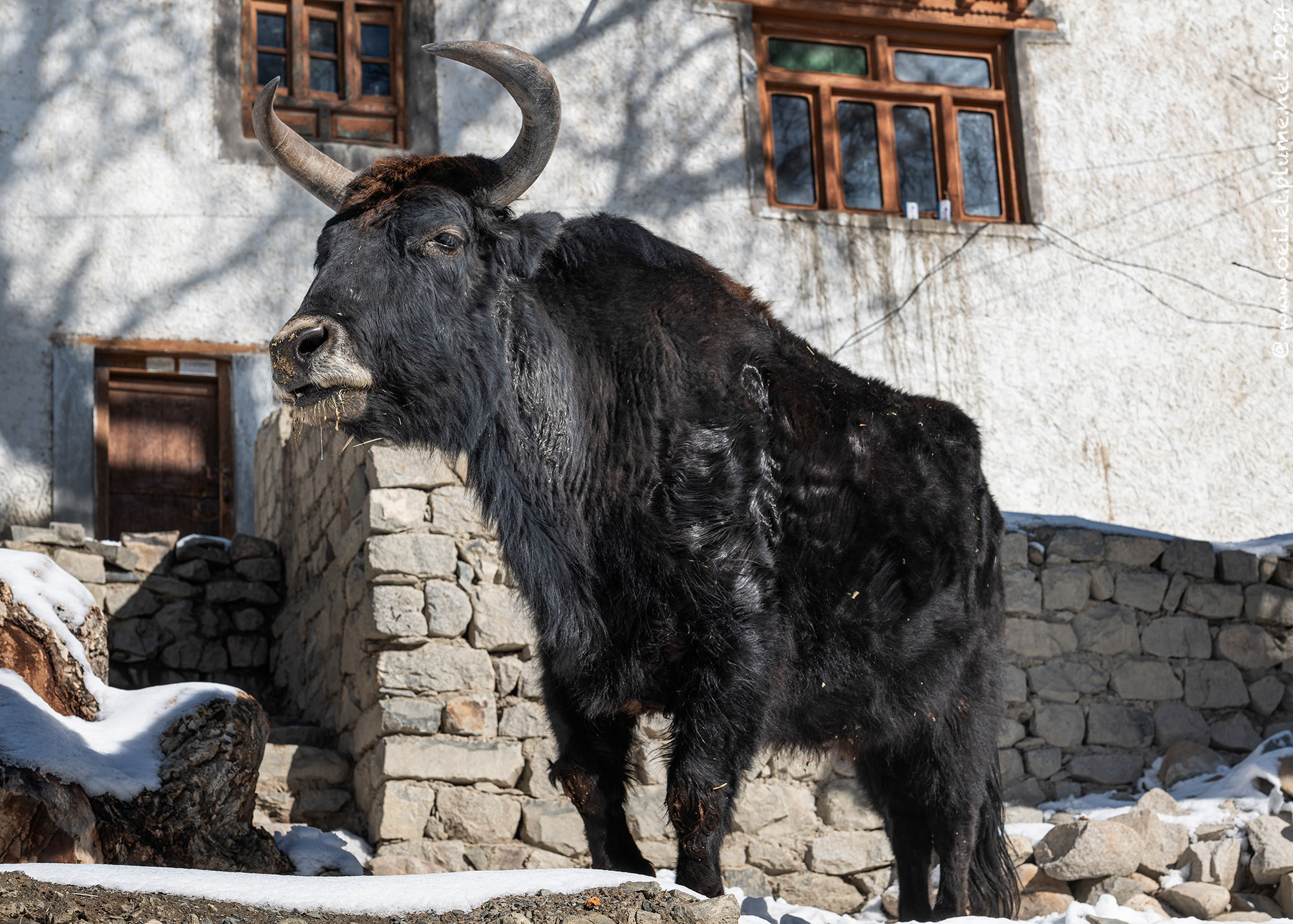 On our way to the last village of our itinerary, we came across a yak herd progressing quietly but surely across snow-capped fields. What a well-prepared animal for the Himalayas! Yet, local people raise fewer yaks compared to the past, as their heavy-duty portering and farming tasks have diminished in volume in recent decades. Smaller-sized cattle are often preferred those days.