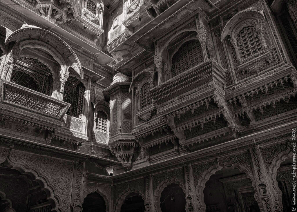 Over several days, I returned to the Jain temples of Jaisalmer at different hours, observing how shifting light transforms the carved sandstone and marble surfaces. I spent long, quiet, and contemplative moments within their walls — absorbing the serenity of the spaces and connecting with the profound spiritual energy they radiate. My work aims to capture the subtle interplay of light, silence, texture, and devotion that define these sacred spaces shaped by centuries of Jainism.