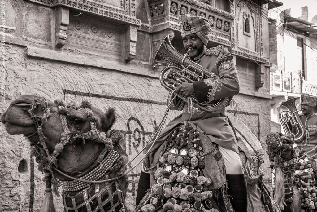 An Indian Border Security Force (BSF) unit entrusted with guarding the international border in the Thar Desert leads the opening parade. Their brass and drum fanfare kickstarts loudly the progression of the caravan across the old town. Camel riders in traditional attire guide them through the old town, creating a moving tapestry of colour. Various performant groups follow the camel-riding squad – young women in Rajasthani traditional dress, musicians, dancers, acrobats. The colourful and noisy folk reaches a large public stadium where the official celebrations and the competitions will take place.