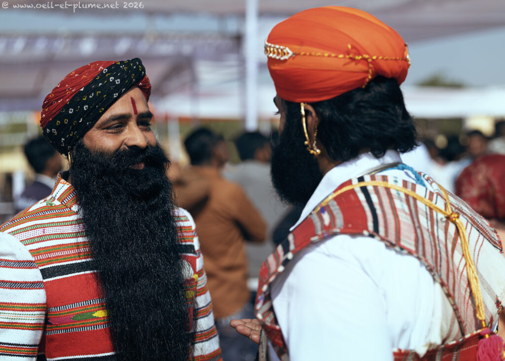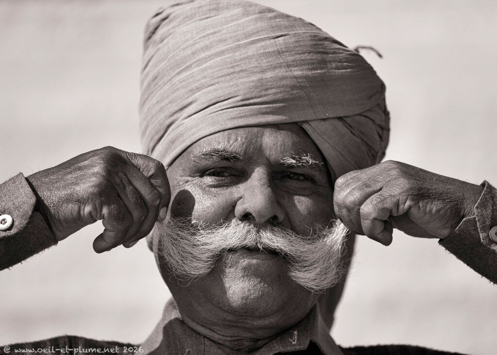 “I did not cut my beard since seventeen years” stated proudly one of them to me. The venerable beard of those Rajasthani men is so long that it is usually tied around the neck or placed deep underneath the shirt. Once fully extended, its length may exceed the maximum outreach of their hands. Sign of virility, elegance and social distinction, the moustache stands proudly upwards, in a symmetrical, rounded and elegant design.