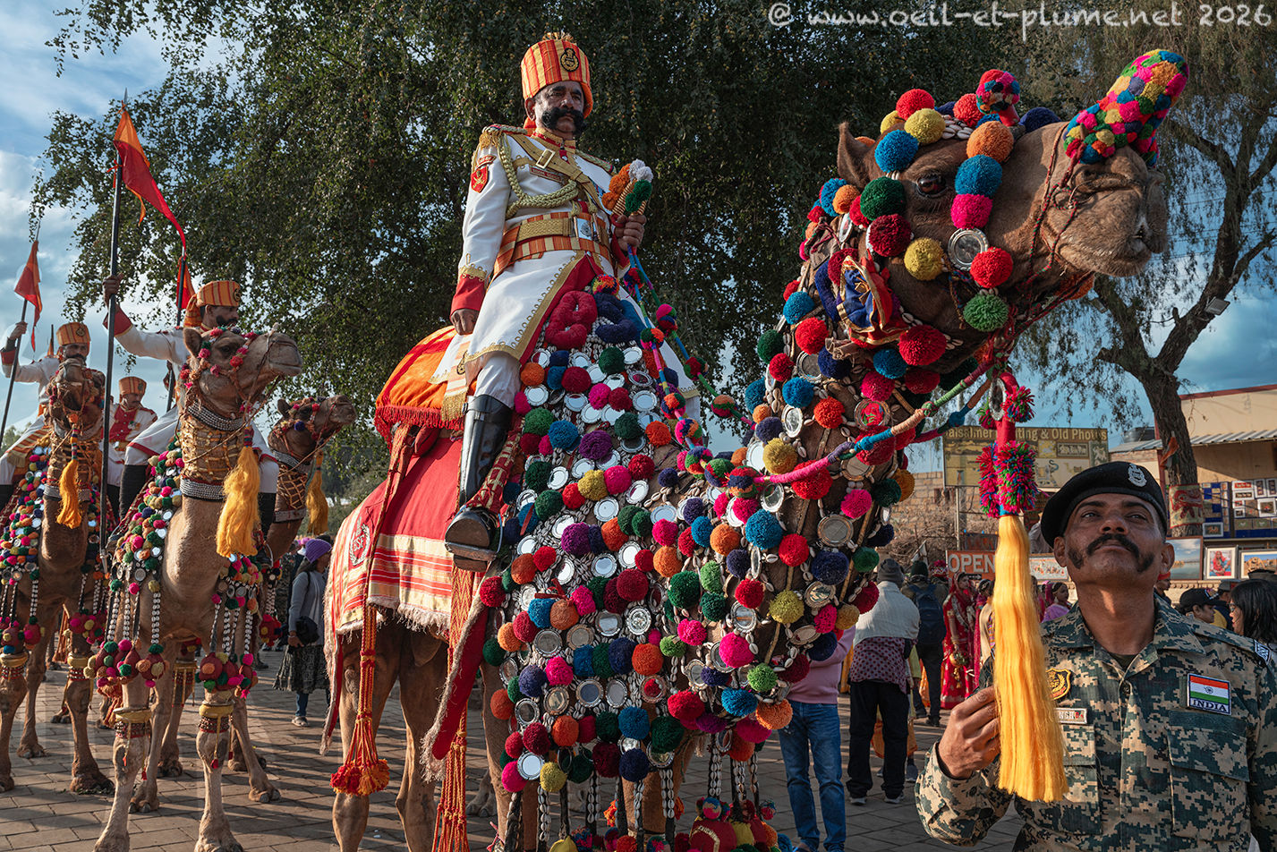 An Indian Border Security Force (BSF) unit entrusted with guarding the international border in the Thar Desert leads the opening parade. Their brass and drum fanfare kickstarts loudly the progression of the caravan across the old town. Camel riders in traditional attire guide them through the old town, creating a moving tapestry of colour. Various performant groups follow the camel-riding squad – young women in Rajasthani traditional dress, musicians, dancers, acrobats. The colourful and noisy folk reaches a large public stadium where the official celebrations and the competitions will take place.