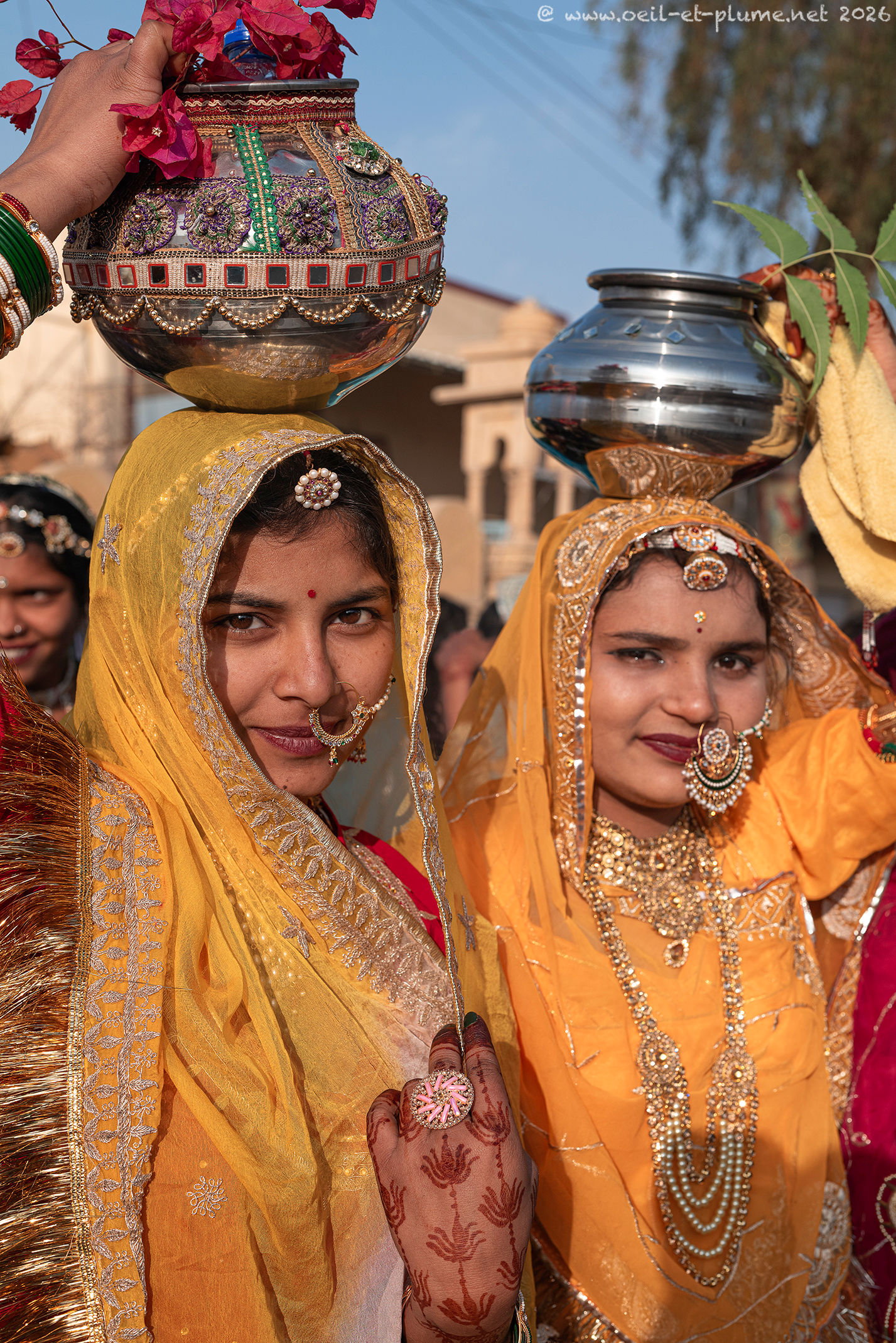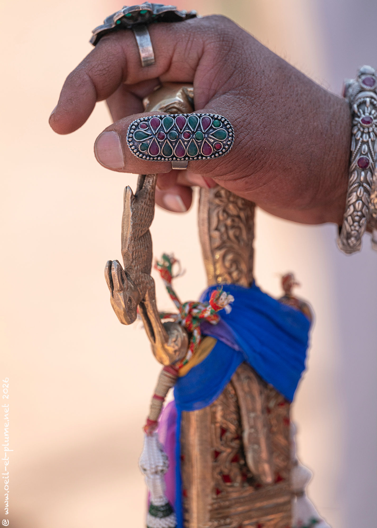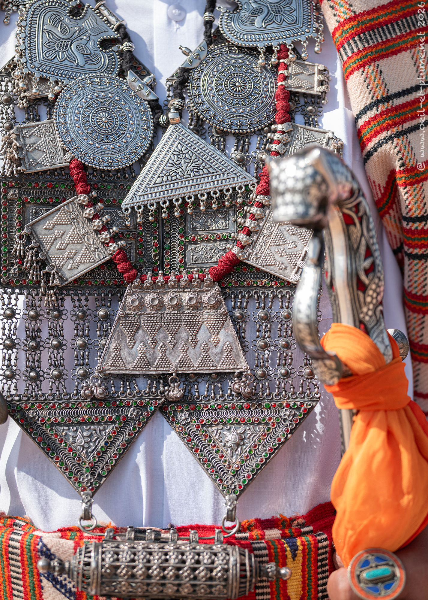 The Rajasthani traditional male dress includes a wealth of silver jewellery, at times enriched with set precious stones. In my appreciation, certain candidates wear over one kilogram of silverware. Furthermore, some of them hold a beautifully carved steel sword to complete the traditional attire.