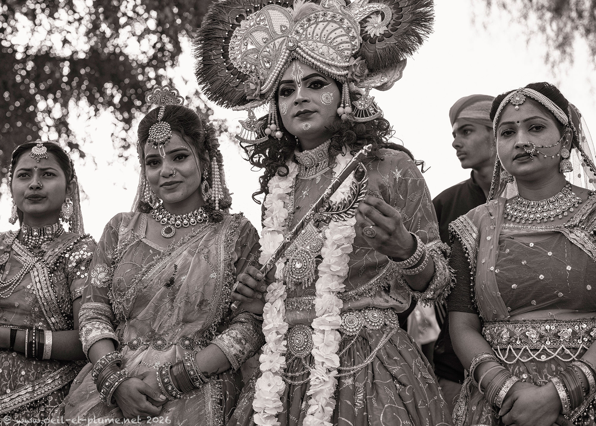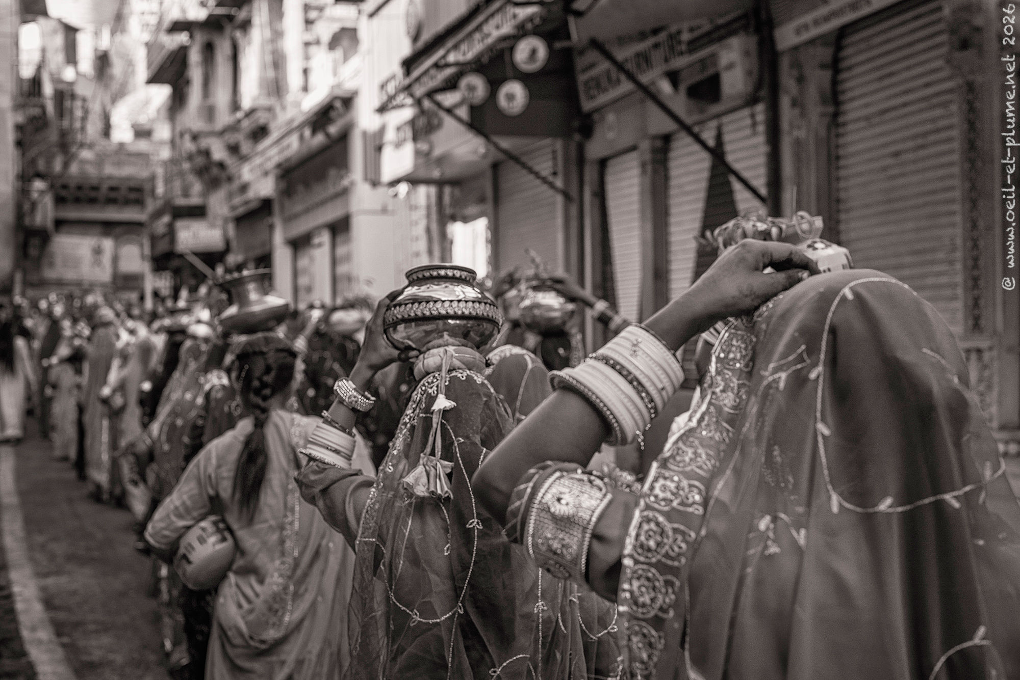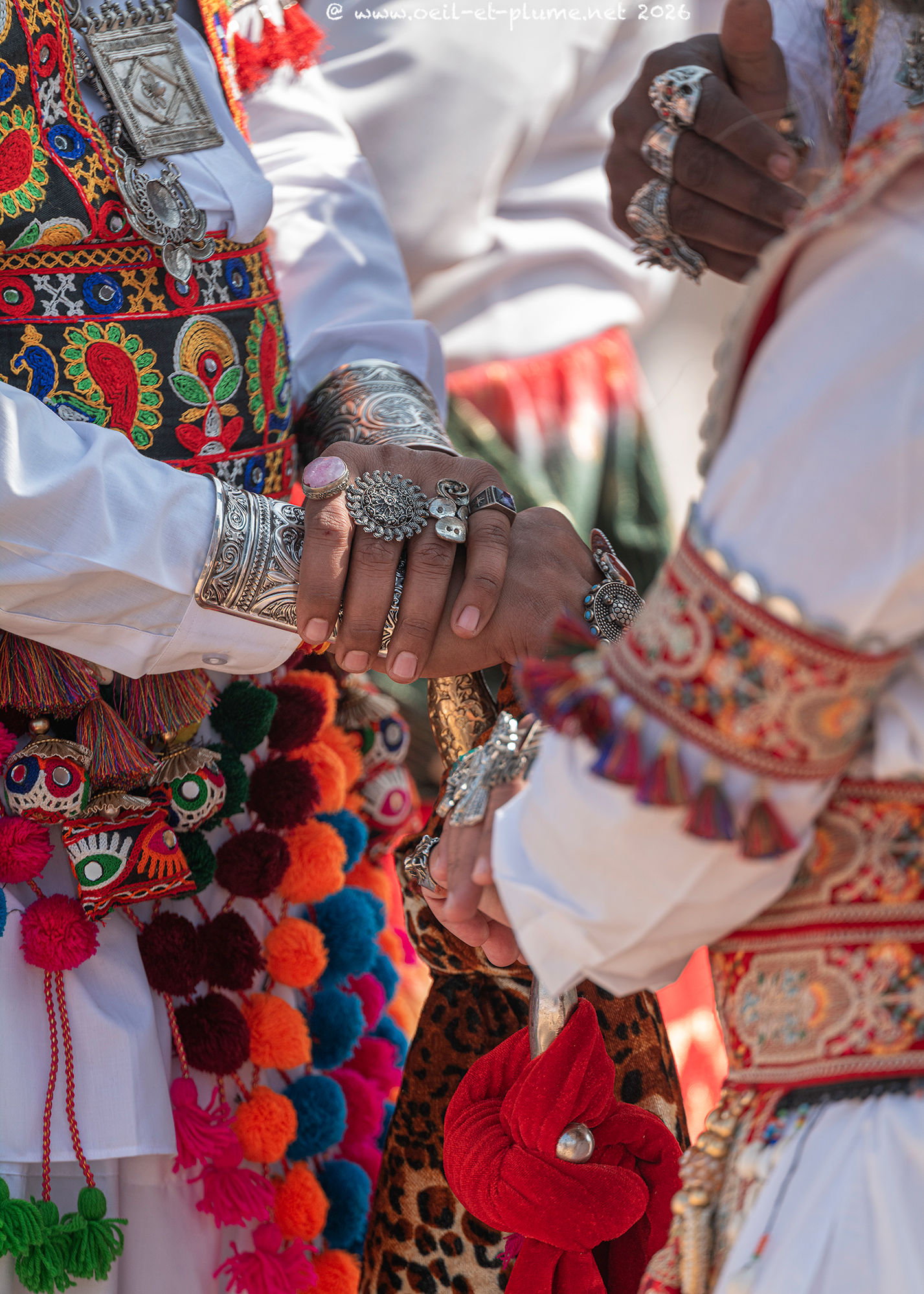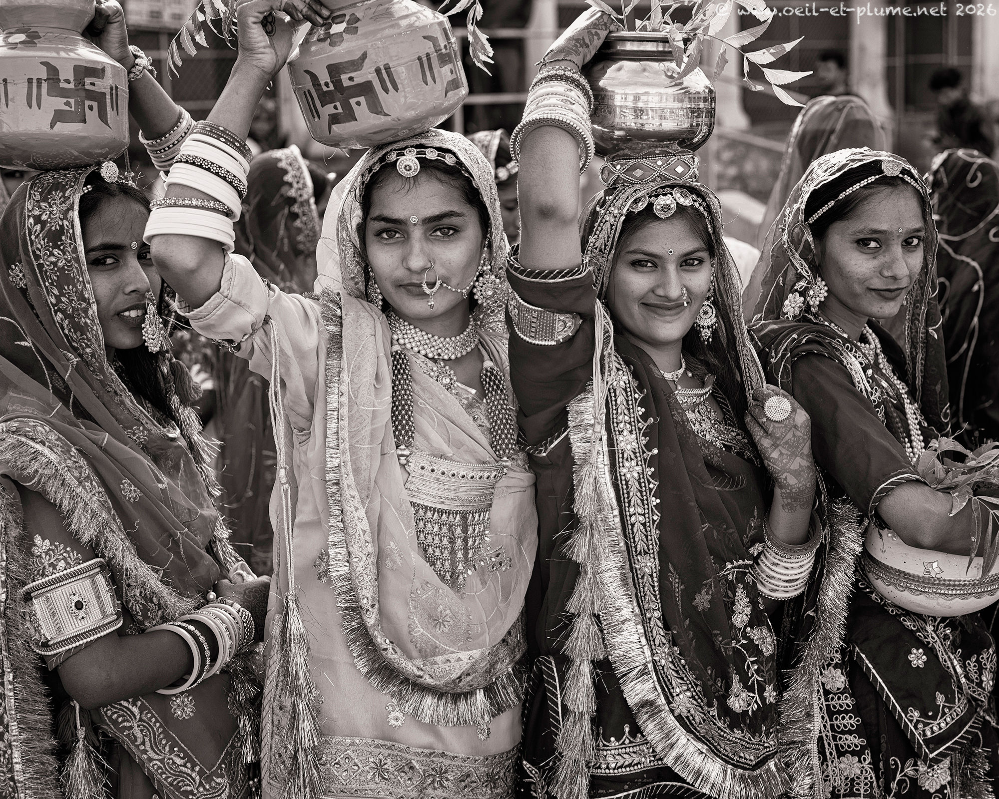 The Rajasthani traditional male dress includes a wealth of silver jewellery, at times enriched with set precious stones. In my appreciation, certain candidates wear over one kilogram of silverware. Furthermore, some of them hold a beautifully carved steel sword to complete the traditional attire.