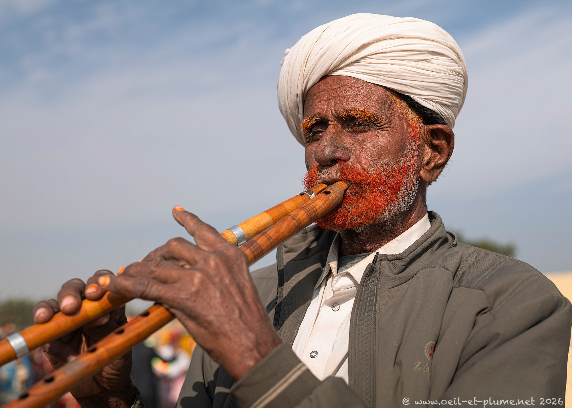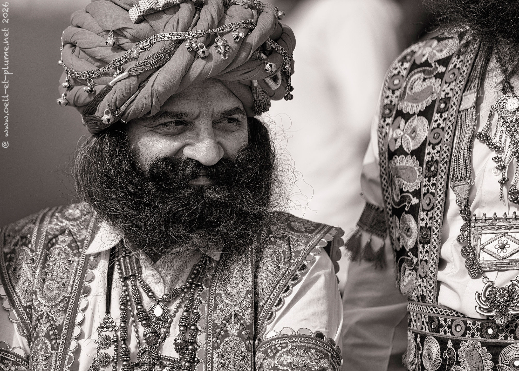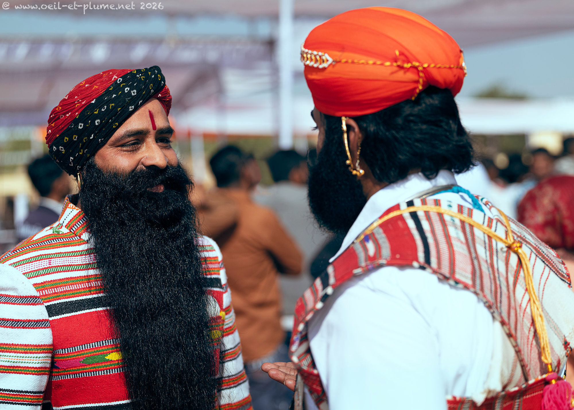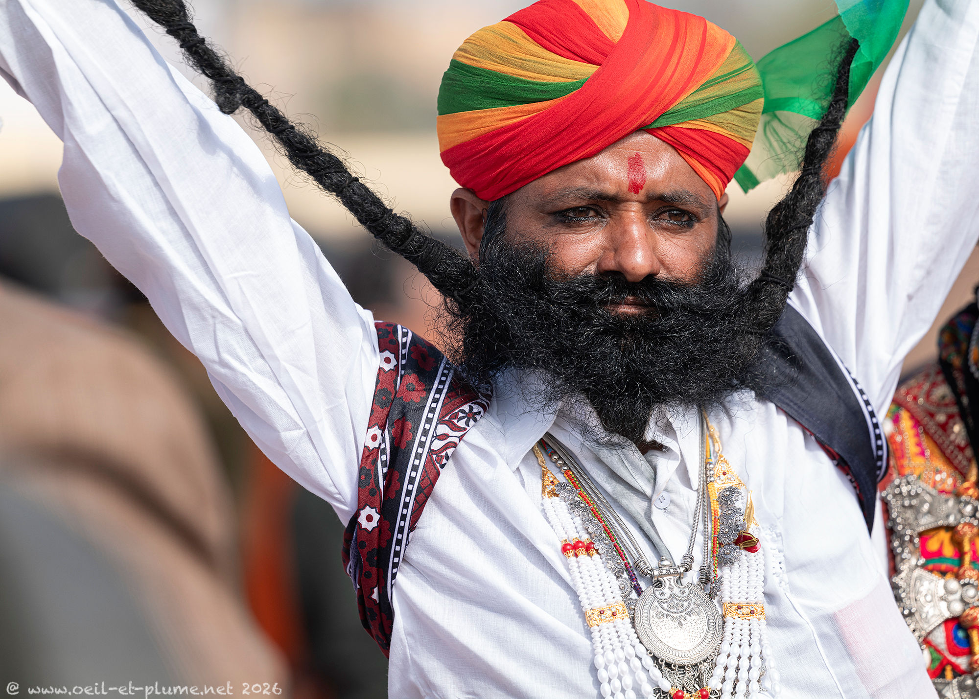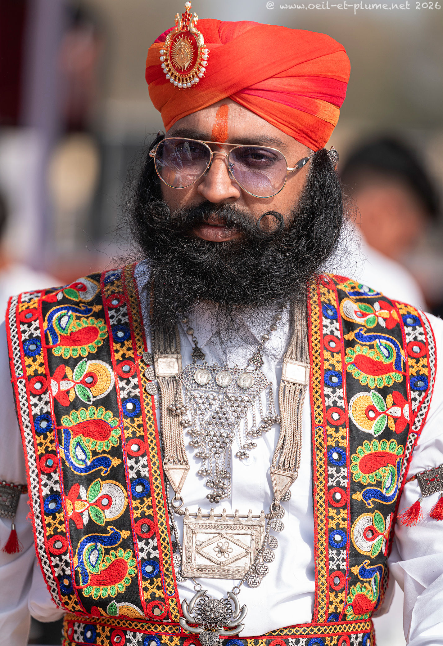 “I did not cut my beard since seventeen years” stated proudly one of them to me. The venerable beard of those Rajasthani men is so long that it is usually tied around the neck or placed deep underneath the shirt. Once fully extended, its length may exceed the maximum outreach of their hands. Sign of virility, elegance and social distinction, the moustache stands proudly upwards, in a symmetrical, rounded and elegant design.